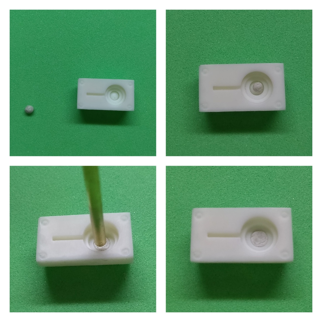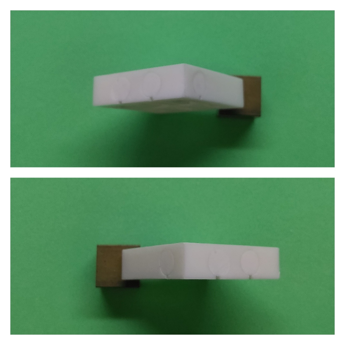 フタパーツを仕上げたら、本体パーツの穴にピンを外向きにして勘合確認をします。