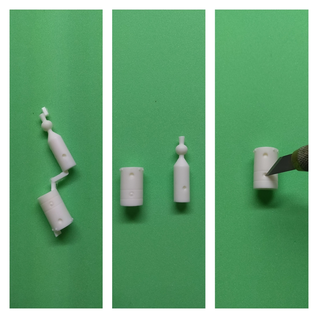 バッテリーと煙突パーツです。穴の奥がヘソ状になっている所はナイフで抉っておきます。