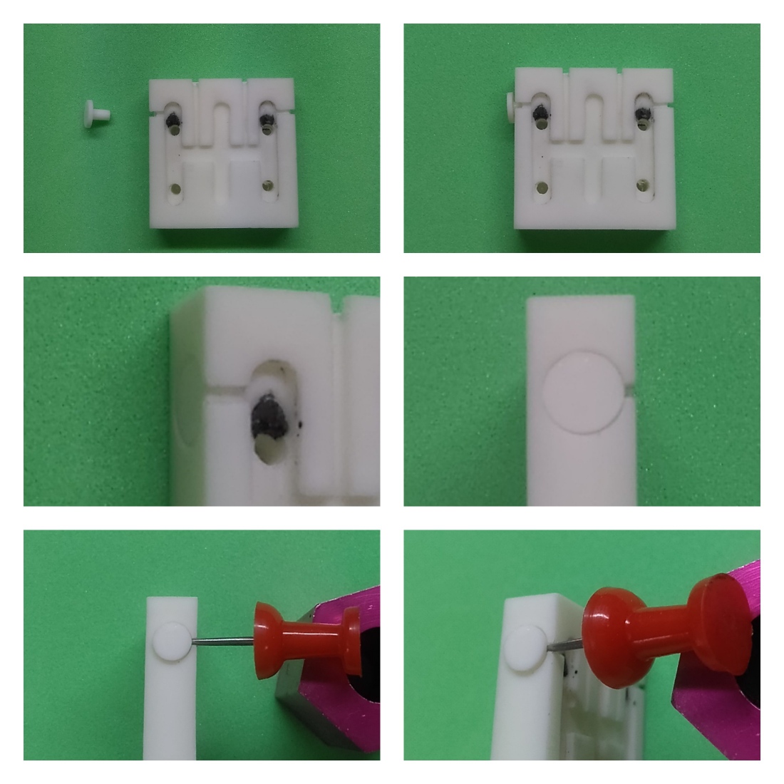 フタパーツを仕上げたら、本体パーツの穴にピンを外向きにして勘合確認をします。