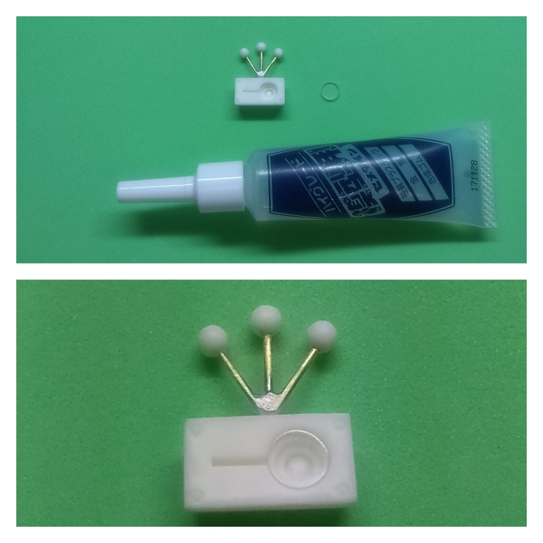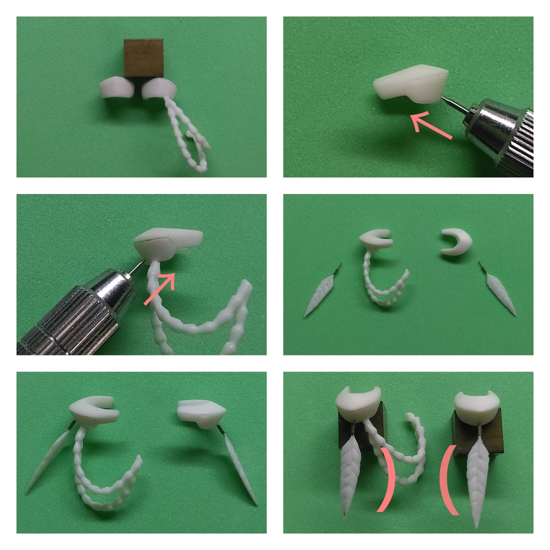 マジックハンドパーツも車輪と同じく、2ミリドリルで少し穴あけしてシアノンで調整していきます。工程は車輪と同じなので省略させて頂きます。